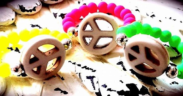 Sterling silver beaded ring with neon beads in choice of green, yellow or pink with cream peace symbol.